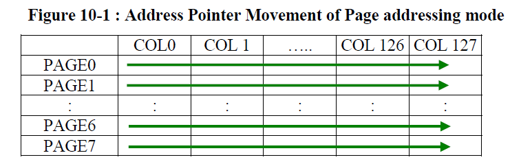 这个属于页寻址模式,当然还有其他寻址,为了描述的简洁性这里不列出,详细内容查看说明书应该不难理解。这样对这个表格位置的确定就转换成了如何确定寻址模式,如何确定PAGE,如何确定起止列。与LCD1602类似,去查看OLED的指令表就可以搞定了,指令表中描述的非常清楚了。